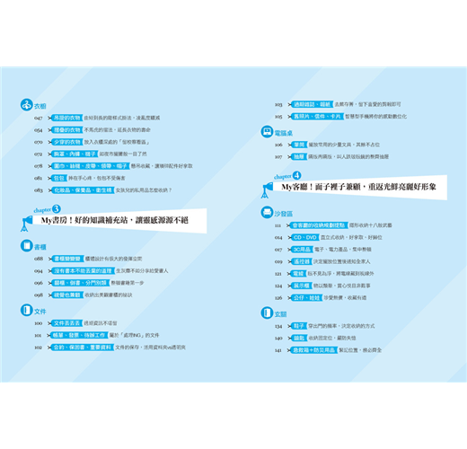 收納重點2。以家庭為舞台、房室為單位,獨創系統性的收納教學!寢室、書房、客廳、廚房、浴室……鉅細靡遺的「分區」收納大全!
