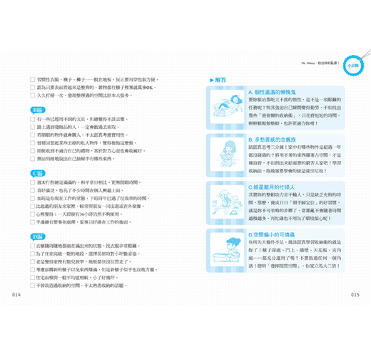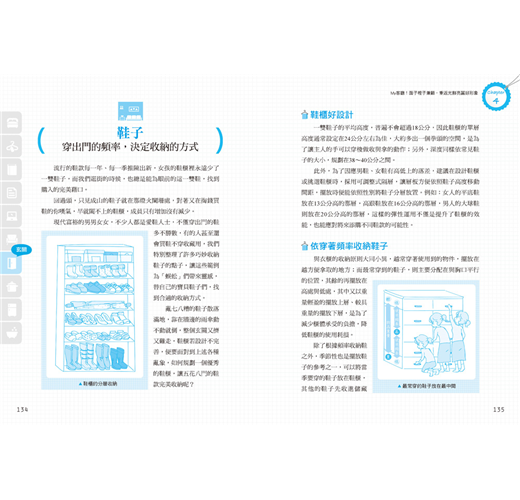 書中充滿大大小小的詳實圖解,古錐的物件圖、清晰的剖面圖、具體的情境圖、收納前後對照圖……給讀者最好讀易懂的收納教學!一步一步照著做,隨手實踐、即刻見效!不需要天份或才華,讓收納成為一項難度零的生活好習慣!