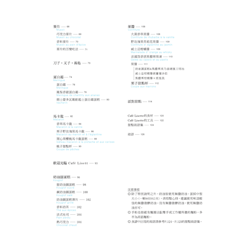 《Café Lisette的甜點》一書充滿各種人的喜好:我至今遇過的所有人、身邊的人或來到咖啡店的顧客。如此之外,感謝各位提供的意見,讓我完成意想不到的食譜。