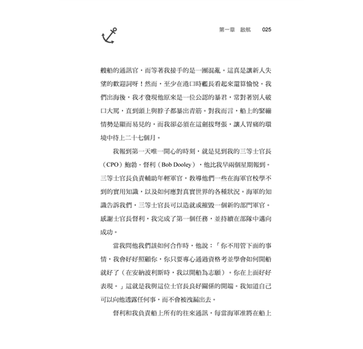 以羅伯.史托佛(Robert Stover)作為例子,當年他以少尉的身分到班福特艦報到時,看起來實在不太聰明。這位來自阿肯色州,動作慢吞吞的小子,曾在一艘狹小的兩棲戰艦服役,那艘船的最高時速只有十二節。高科技的班福特艦則全然不同,全速前進代表的是三十一節,他必須以飛快的步調處理官兵的事務,以前他從不需要這麼迅速地作出這麼多決策。