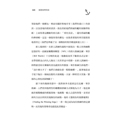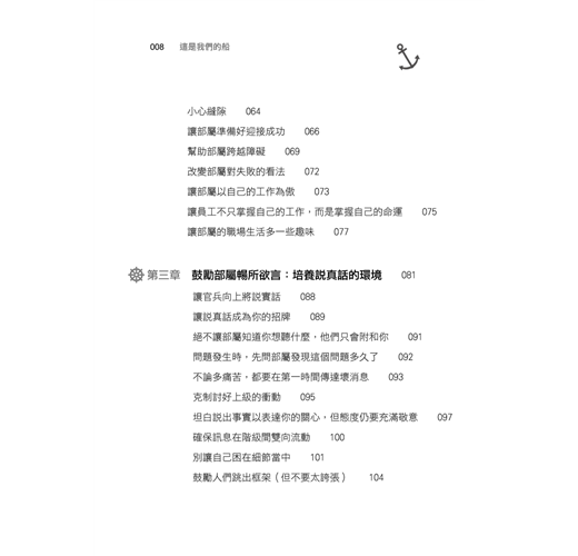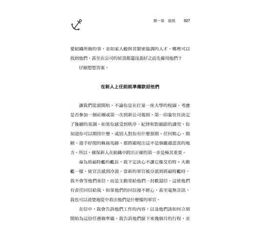 歡迎大家上船:領導者應該懂得吸引對的人才,運用熱忱、歡迎來帶領新員工上任,並使他們快樂且期待每一天的工作。下馬威只會使新成員感到惶恐,惶恐只會阻礙任務的達成。