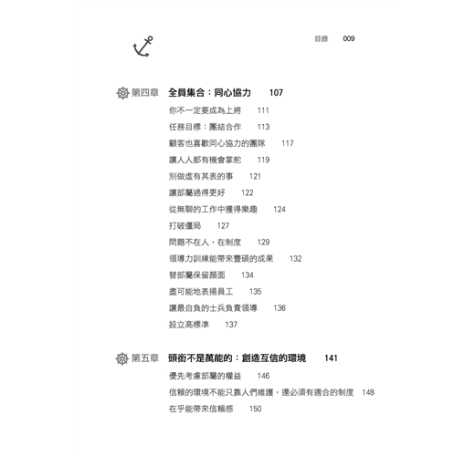 企業和海軍一樣有一堆枝微末節的規定,使人們無法採取主動並做對的事情。當高登.班休(Gordon Benthune,他恰巧曾是海軍預備役的特等士官長)以及葛瑞格.柏瑞門(Greg Brenneman)分別接任洲際航空(Continental Airlines)執行長與總裁時,他們接手了一本九英寸厚的書,裡面全是繁複的規定,這本書以「不該做手冊」為全體員工所知。