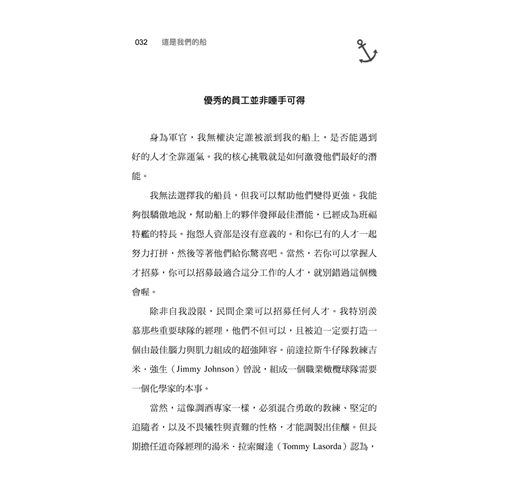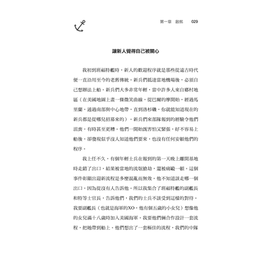 我試著對我的官兵做同樣的事情。當然,我不能把海軍準則燒掉,但在謹慎的前提下,我可以、也曾經挑戰或避開了許多不合時宜的規定,並且賦予它創新的詮釋,以激勵我的官兵做到最好。而我的官兵則教會了我謙卑與振奮。我不曾期待他們的表現會遠超過我的期望。我們想出以下技巧以發掘出彼此最好的一面。