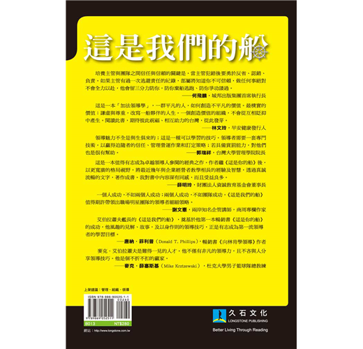 「艾伯拉蕭夫艦長的《這是我們的船》,奠基於他第一本暢銷書《這是你的船》的成功,他風趣的見解、故事,及以身作則的領導技巧,正是有志成為第一流領導者的學習目標。」