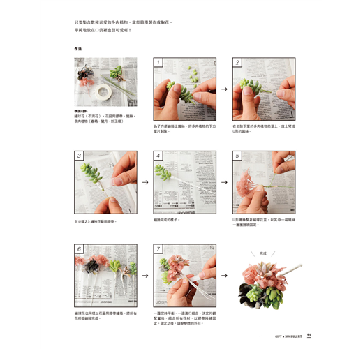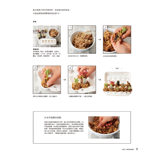 想要與朋友一起分享多肉植物的樂趣時,書中也介紹多款送禮提案,作成花束、或裝在蛋盒裡,一定能讓收到禮物的人驚喜連連吧!
