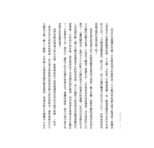近日我那已就讀國三的孩子,因為抱著《寄生蟲圖鑑:不可思議世界裡的居民們》這本書啃讀,進階版發現鳥糞的功用何止繁殖植物。這世界上有一種叫做「彩幼吸蟲」的寄生蟲,牠寄生在蝸牛體內以後,會讓蝸牛一愣一愣地爬上樹梢,在一眼可及的葉片表面上蠕扭移動,甚至搖擺伸縮觸角,使蝸牛看起來像是鳥兒最喜歡獵食的「斜紋夜盜蟲」的幼蟲在手舞足蹈,等於在大肆呼喚小鳥我就在這兒哪、你趕快來吃我啊。倒楣可憐的宿主蝸牛,因此難逃被鳥吃掉的命運,彩幼吸蟲入侵鳥體的目的也於焉達成。鳥糞沒有我想像的那麼簡單,對小讀者來說,鳥糞無疑是個充滿學問的小宇宙。