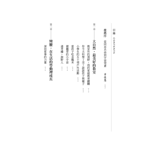 名人推薦:「要怎麼做,才能讓孩子是條悠哉的涓涓小溪,卻也能隨時引他們進入滾滾大河,還能安然順行?……這本書,是一場從同舟共命到宇宙穹蒼的旅記,既細微且浩大,既安身也立命。」——兒童文學作家 幸佳慧