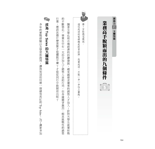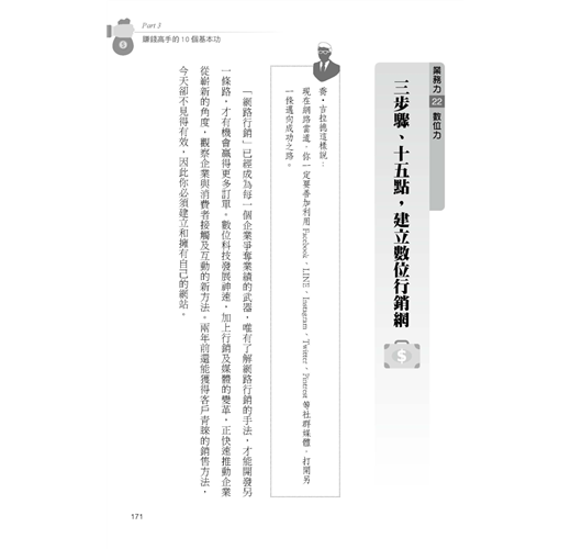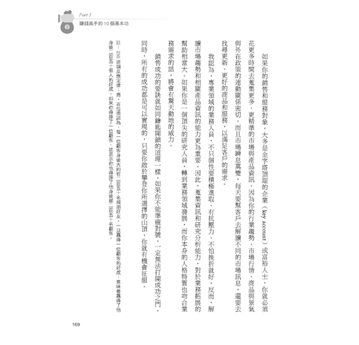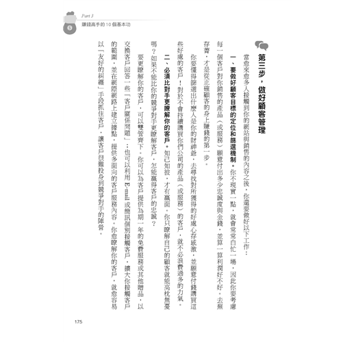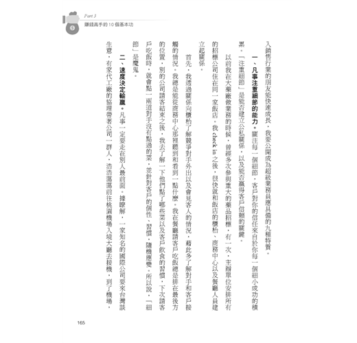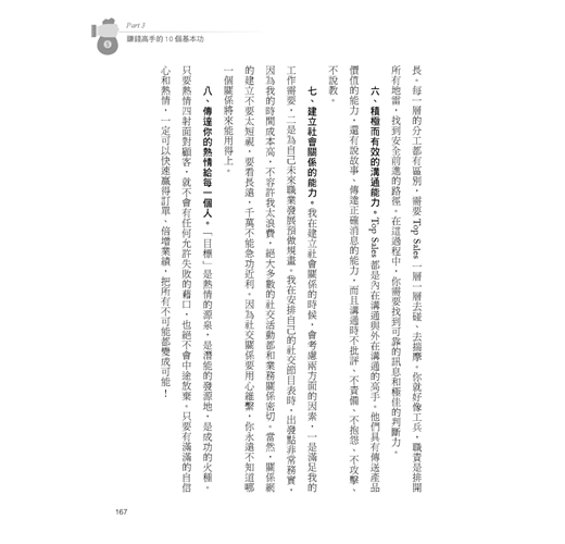 第三章10則賺錢高手的基本功,奠基於前兩章──養成健全的心態又有優良的銷售技術。這階段,你不妨試著給自己訂下目標,例如,學習像喬.吉拉德那樣,成為一個「可以把世界上任何東西賣給任何人」的銷售員。該怎麼做?將這10項基本功都做到位,業績自然流進來。
