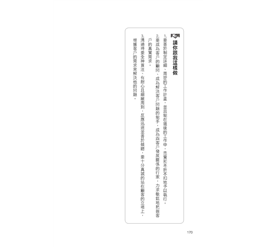 做業務、銷售工作首重成交,第一章提出了10則讓你「一出手就成交的業務力」法則,解析當業務面對客戶時,如何從心、從情、從理、從技術上,突破客戶的心理防線、價格防線或購買防線……,不但買單你銷售的產品,還能幫你介紹新客戶。