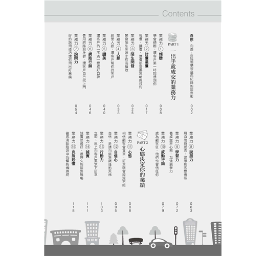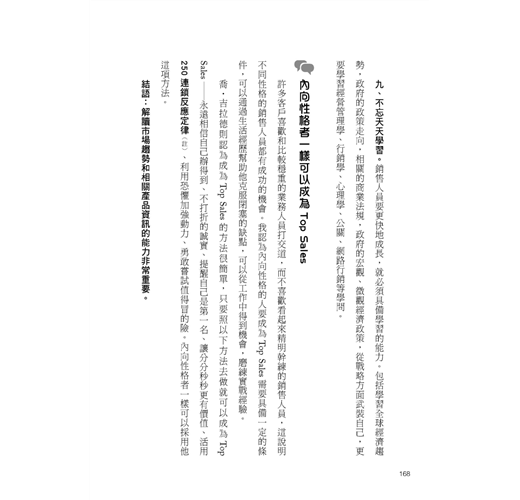 要擁有第一章的銷售技術並創造愈來愈好的業績,銷售員的心態很重要。要敢於要求客戶下單、克服陌生拜訪的恐懼、做好時間管理、如何面對客戶的拒絕,以及度過業績低潮期,端視是否做好心理建設並培養出超強的業務心態。第二章的10則決定業績的心態養成術,是有志於成為優秀業務的人員,不時翻閱惕勵自己的良方。