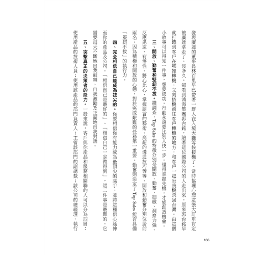 3.要有彈性和權宜應變。Top Sales和Low Sales之間的距離其實只有一點點──Top Sales可以無數次修改方法,但絕不輕易放棄目標;Low Sales總是變更目標,就是不改方法。Top Sales習慣權宜應變,Low Sales不肯權宜應變,死抱著計畫不放。