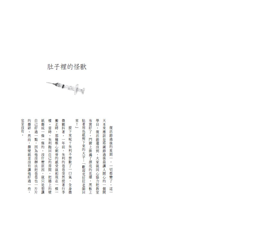 朱利也很想一拳捶下去,或是把口袋裡那個紅色的笨人偶拿出來,狠狠的往窗戶丟,讓玻璃窗發出刺耳的破裂聲,尖銳的碎片散得到處都是。然而,朱利的手像提線木偶那樣不由自主的懸在半空中,因為他聽見克拉拉老師十分篤定的說:「病情沒辦法改善了。真的!」