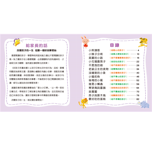 1.針對孩子粗心、不認錯、沒禮貌、不愛護環境……等行為,編寫14篇豐富有趣的故事,讓孩子邊聽故事邊學習。