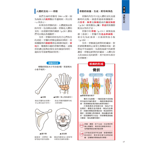 此書將人體依器官系統分類,分成運動系統、腦部與神經系統、循環系統及血液
