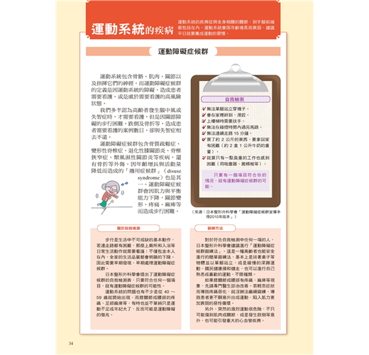 日本整形外科學會提出了運動障礙症候群的自我檢測表,只要有一個項目符合,就有運動障礙症候群的可能性。