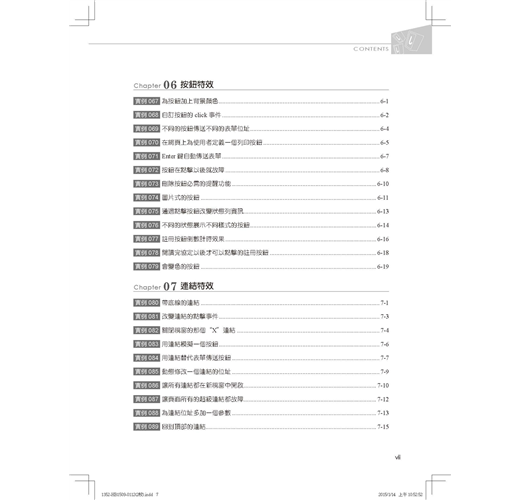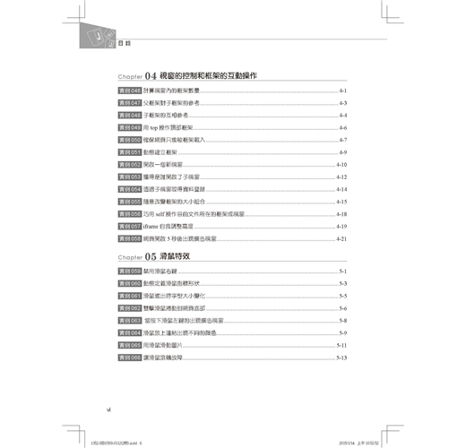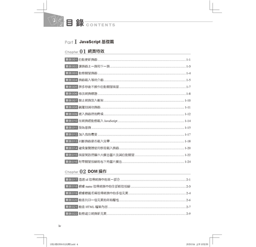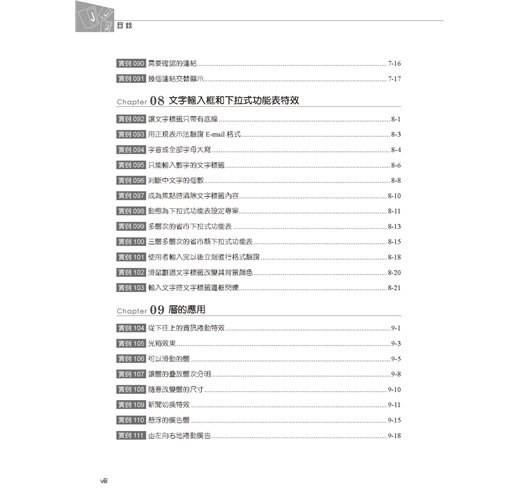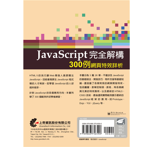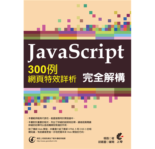 本書分為3篇26章,一共收集了300個經典的實際範例,不僅涉及JavaScript的基礎語法、開發技巧、物件支援等基礎知識,還涵蓋了各類常見的網頁開發特效,包括圖層、表單控制項、表格…等各類網頁元素的特效應用,以及最新的HTML5、CSS3技術。最後還用實際範例展示最新的JavaScript框架的應用,如Prototype、Dojo、YUI、jQuery等。