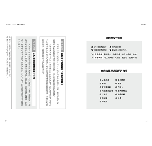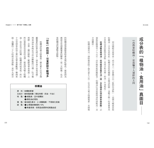 【最實用】在內文和知識專欄中,列舉各項食品成分及注意事項,例如噴式奶油其實是沙拉油製品、添加酥油和反式脂肪的食物列表等。