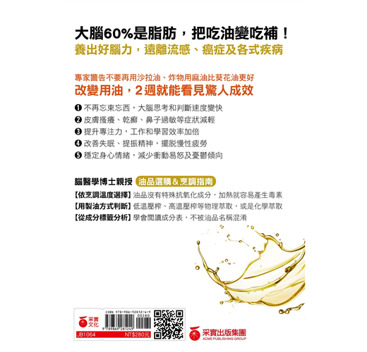原來,油會直接影響「大腦」健康。攝取好油,就能預防九成疾病。作者身為腦醫學博士和阿茲海默症權威,用專業知識分析食用油對大腦和身體的影響,並且詳細解說各種油品成分,為你提示該怎麼吃、怎麼選,從每日飲食中找回健康。