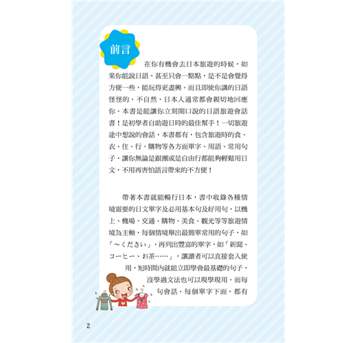 好實用──羅列日本遊玩一定會用到的單字、必用句型、高頻使用句,每一句句型皆可搭配多個單字,方便你代換單字靈活運用句型,單字及句子均附羅馬拼音及ㄅㄆㄇ注音,保證好讀!讓你在日本也能輕鬆表達自己的意思。