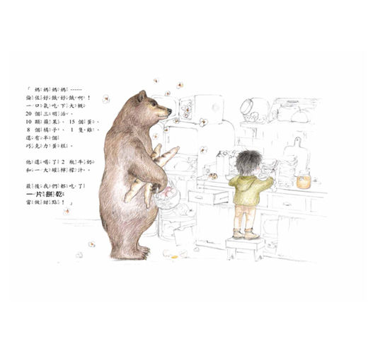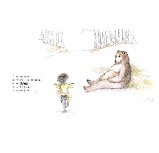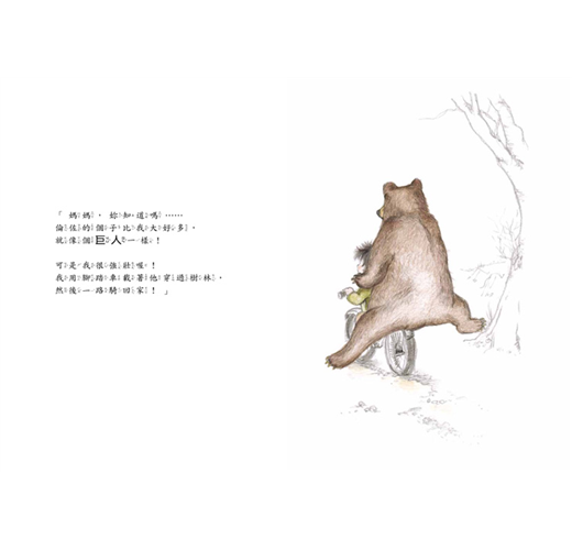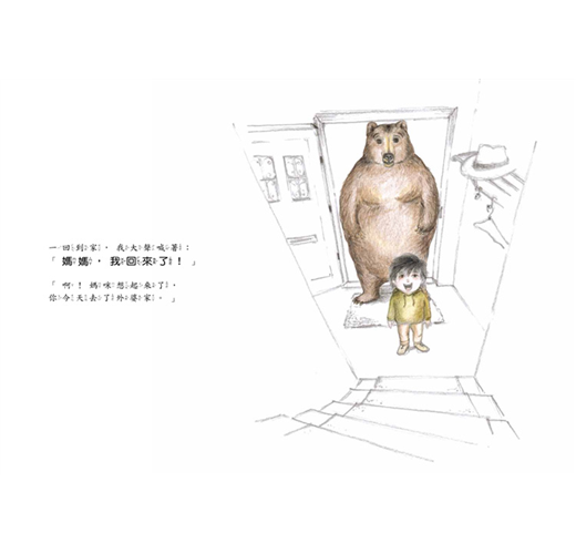 這書的每一張插圖都是以咖啡色系為主,再少少搭配些許其他顏色,以及單純的背景,色彩雖少,卻張張引人注目,讓孩子在聆聽故事的同時,能夠把所有的注意力全都放在小男孩和大熊這兩個主角的故事發展上。