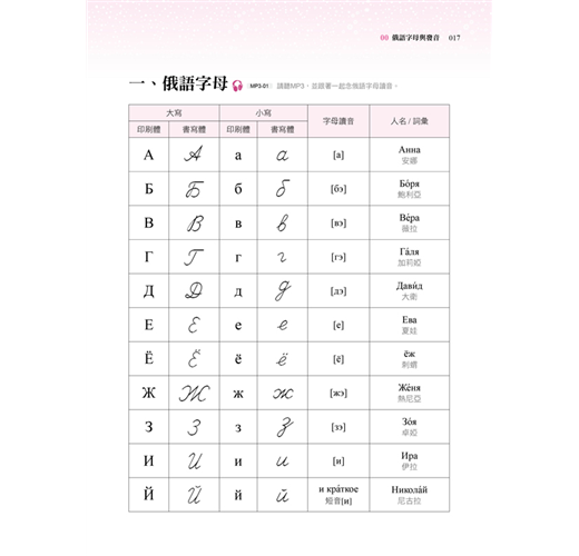 現代俄語共有33個字母,有大、小寫之分。而字體又有印刷體與書寫體之分。本書開頭即列出表格,教您辨識字母大小寫、字體與讀音。接著介紹母音、子音發音規則,以及調型的表現。