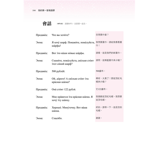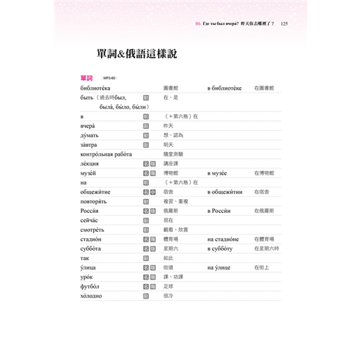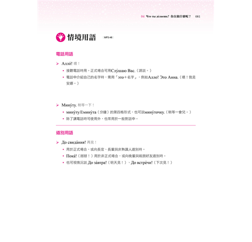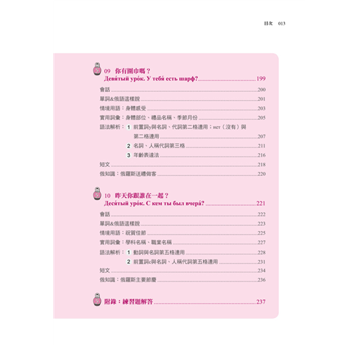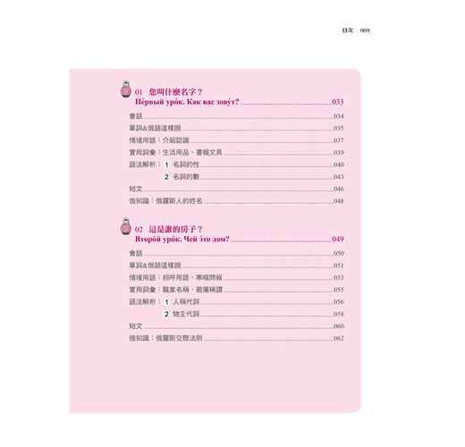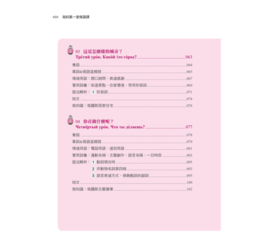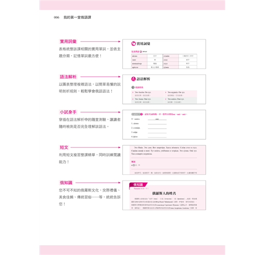 您知道俄羅斯人的姓氏有男女之分嗎?俄羅斯傳統佳餚又有哪些呢?每課最後的「俄知識」,告訴您最有趣、新奇又實用的俄羅斯文化,讓您深入了解俄羅斯。