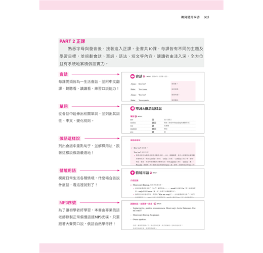 3. 多元又實用的內容:本書囊括日常生活會話、詞彙以及情境用語,讓您輕鬆活用俄語,快速熟悉俄語!