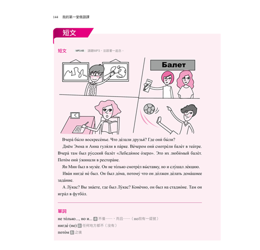《我的第一堂俄語課》專為完全不懂俄語的學習者量身打造,只要跟著本書安排的學習進度及內容,就能掌握最基本的發音規則、文法、生活用語,並且兼顧聽說讀寫四大能力!