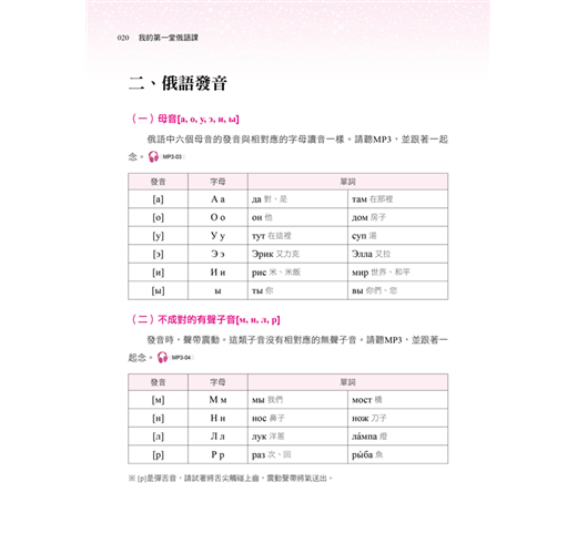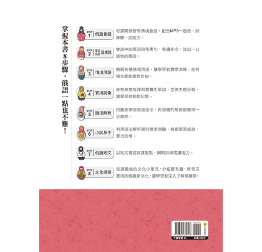 除此之外,隨書附贈俄籍名師親錄標準俄語發音+朗讀MP3,讓您隨時都能邊聽邊學,打下聽力、口說紮實基礎!
