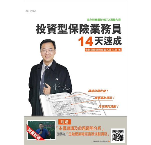 《投資型保險商品業務員14天速成》融經典試題於各章重點整理中,並收錄2回模擬試題提供讀者自我演練,讓您面對保險相關證照考試,輕鬆掌握考試關鍵!