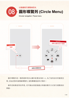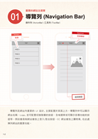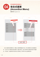 導覽列 (Navigation Bar)/頁籤列 (Tab Bar)/列表選單 (List Menu)/收合式選單 (Accordion Menu)/跳板選單 (Spring Board)/下拉式選單 (Pulldown Menu)/滑動選單 (Slide Menu)/圓形瀏覽列 (Circle Menu)