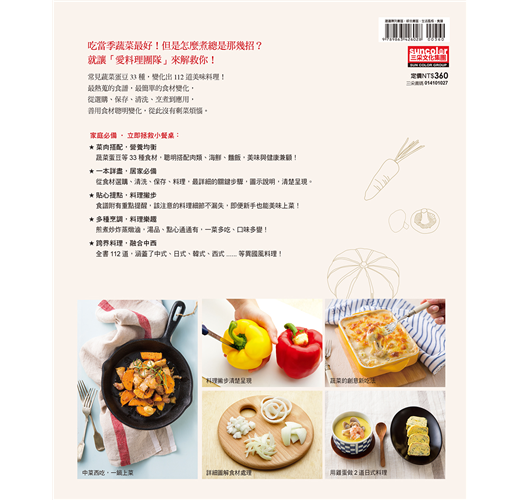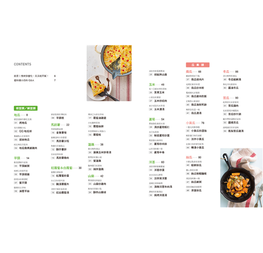 四季常見的各式蔬菜,地瓜、南瓜、番茄、蘿蔔、馬鈴薯、高麗菜、花椰菜、洋蔥、金針菇、四季豆……等33種,包含根莖類、鱗莖類、瓜果類、包菜類、葉菜類、豆菜類、菇類、雞蛋、豆腐,從選購、保存、清洗、烹煮到應用。