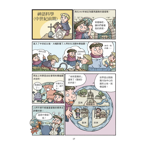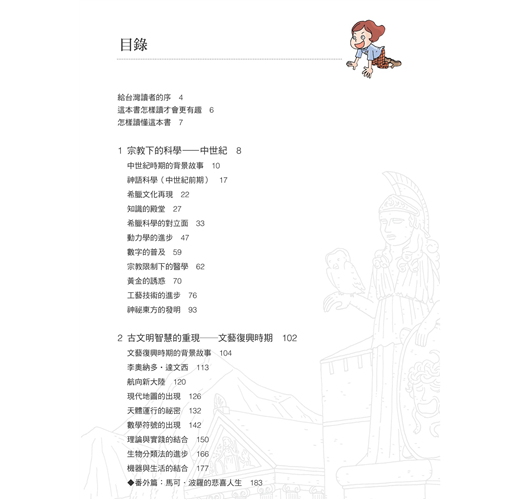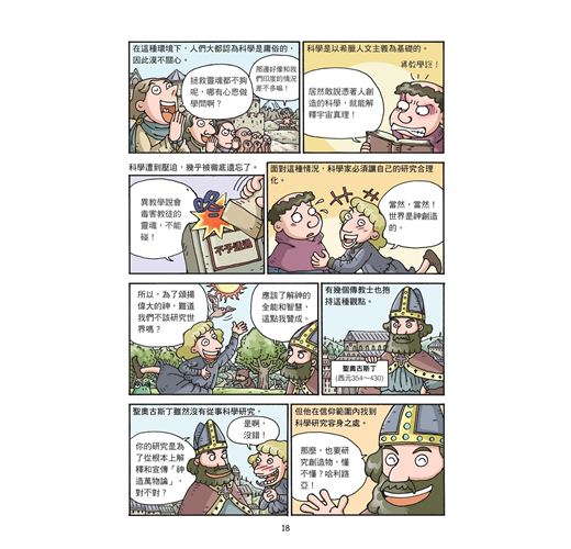 本書從趣味的角度出發,網羅了數學、物理、化學、天文、醫學、地球科學、現代科技等領域,闡述科學與各時代背景。書中並補充科學家相關軼事,用生動有趣的漫畫,讓讀者對故事印象深刻,在正式學習到這門學科時,會比其他人更容易記住這門學科,也能夠有更好的聯想與發揮。