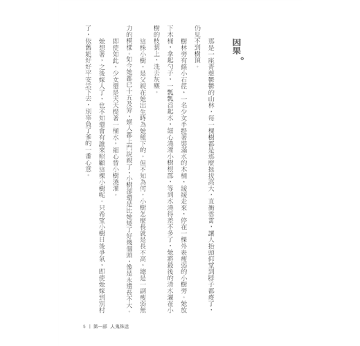 只是,她仍忍不住蹲下一面輕輕撥弄小樹的枝葉,一面半戲謔地說:「小樹啊,我每日這麼勤快地幫你澆水、施肥、除蟲,為什麼你還是老長不大呢?」