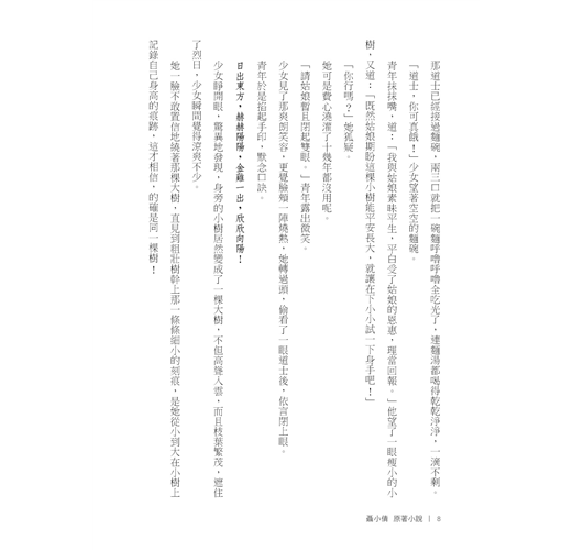 「別小看它。小樹除了長不大,什麼都明白的!我從小就沒什麼朋友,是小樹一直伴著我長大,只是說也奇怪,它怎麼長也長不大,我真怕自己離開村子後,沒人照顧小樹,它會不會——」少女一轉頭,瞬間瞪大了眼。