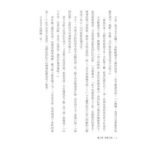 少女輕聲笑了起來,繼續取笑:「我小的時候,爹說你會越長越大,長得比林子裡那些樹都要高大,替我遮風避雨,可是我現在都長得比你高啦。」笑聲漸淡。「如今我都要嫁人了呢,是隔壁村的書生,媒婆前陣子來提親,聽說人呆愣呆愣的,唉……真不想嫁塊木頭……」少女儼然把自己從小照顧的小樹當成了知己,叼叼絮絮說個沒完。