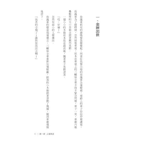 救護車的聲音迅速遠去,三輛保全車重新加速駛離,掉落的小木箱跟著滾動了幾圈,撞到車廂邊緣後停下。