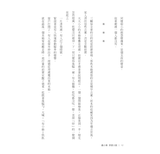 大大小小的木箱堆疊在房裡,拍賣官手裡拿著說明提示,一個一個開箱檢查,正檢查到一半,燈光忽然熄滅,他還沒回過神,下一刻只覺得後腦一痛,有人偷襲,他吭都沒吭一聲,直接「砰」的一聲倒在地上。