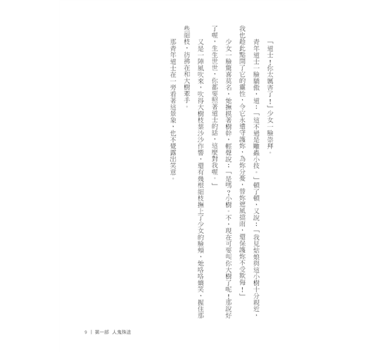 少女一臉驚喜莫名,她撫摸著樹幹,輕聲說:「是嗎?小樹。不,現在可要叫你大樹了呢!那說好了喔,生生世世,你都要照著道士的話,這麼對我喔。」