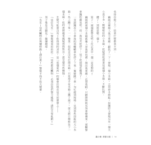 一直跟隨在小卡車後的那輛轎車也停了下來,駕駛跳下車,匆忙趕到現場,見到那些四散的大小木箱,馬上蹲下來,一一檢查,但他並沒有打開木箱,只是用手在木箱上拂了兩下,便又將目標移往下一個木箱,他的表情越來越疑惑與焦急,甚至還有些懊惱。