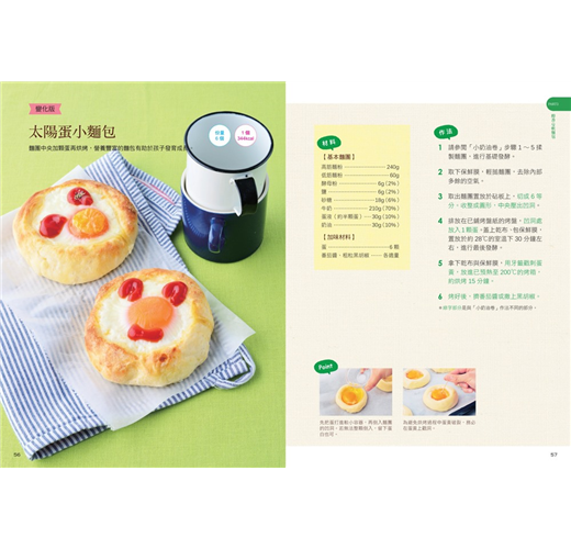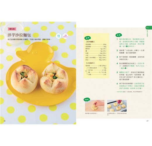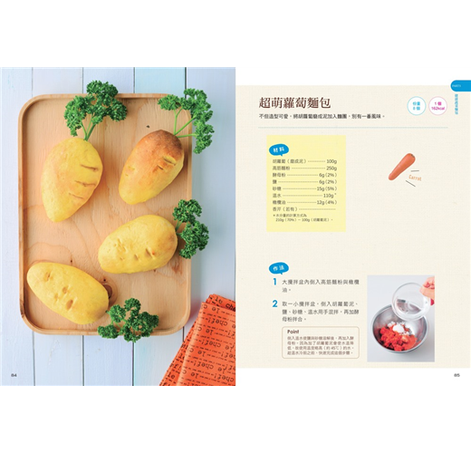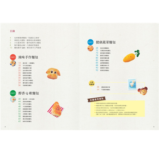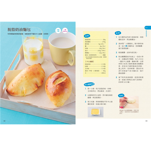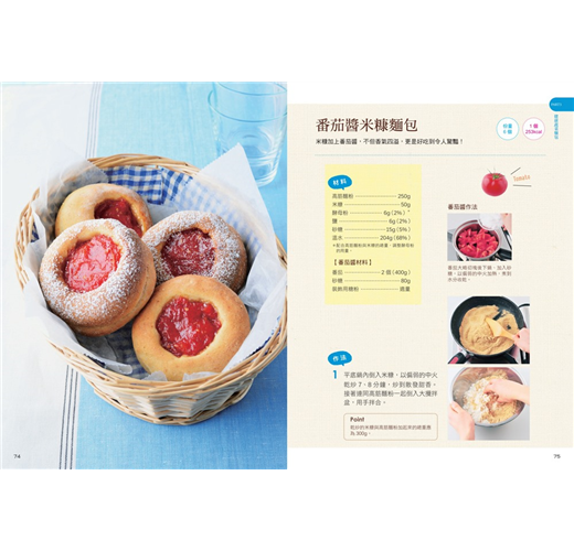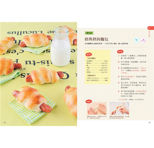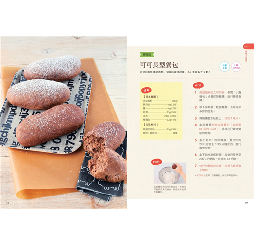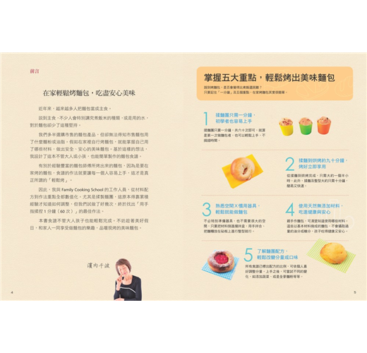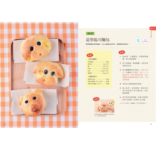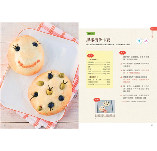 本書以兩種基本麵團為基礎,設計出30種口味多變的麵包品項,詳細解說每一個步驟都搭配圖片且附上清楚的說明,無論是大人、小孩都能輕鬆完成。