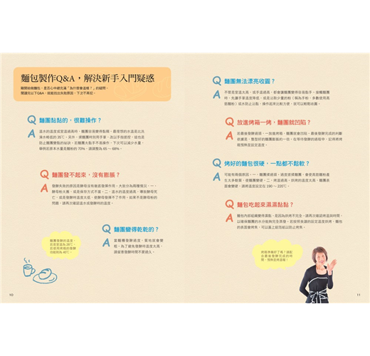 麵團發不起來?為什麼麵包內餡會外露?放進烤箱時麵團凹陷?麵包吃起來濕濕黏黏?一次回答剛開始學做麵包時會遇到的狀況與疑問,幫助新手第一次就烤出完美麵包。