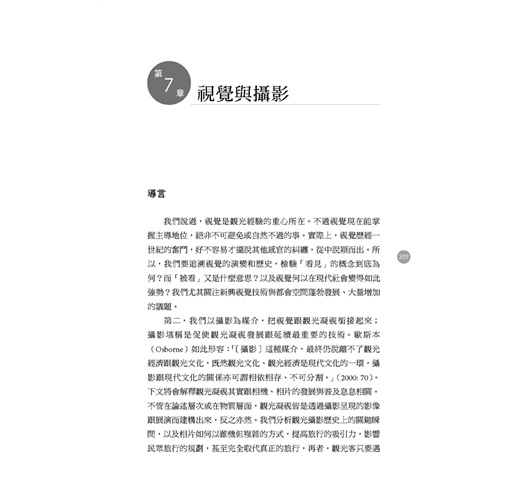 因而本書探討的是觀光凝視在各個社會,特別是在過去各個時期的不同團體之間究竟如何發展和轉變。我們將會闡述觀光凝視被建構與強化的過程,思考究竟是誰或什麼事物授予它權力,剖析凝視行為究竟為其對象,也就是「地方」(place),帶來什麼樣的後果,並且探究凝視跟其他社會行為如何相互影響與關連。「觀光客凝視」可不是什麼個人心理狀態,而是由社會塑模、後天習得的「觀看方式」(Berger, 1972 )。它是動態影像和再現技術建構而成的視野(vision)。如同醫學凝視一般,視覺凝視(visual gaze)在現代觀光所取得的權力,其實結合了或來自於各式各樣的設備技術,諸如攝影機、電影、電視、相機和數位影像。