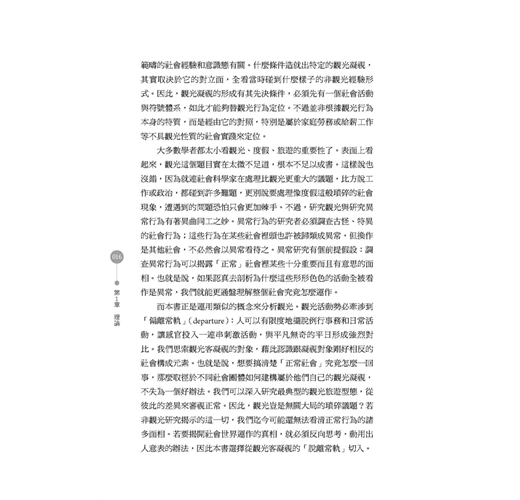 而本書正是運用類似的概念來分析觀光。觀光活動勢必牽涉到「偏離常軌」(departure):人可以有限度地擺脫例行事務和日常活動,讓感官投入一連串刺激活動,與平凡無奇的平日形成強烈對比。我們思索觀光客凝視的對象,藉此認識跟凝視對象剛好相反的社會構成元素。也就是說,想要搞清楚「正常社會」究竟怎麼一回事,那麼取徑於不同社會團體如何建構屬於他們自己的觀光凝視,不失為一個好辦法。我們可以深入研究最典型的觀光旅遊型態,從彼此的差異來審視正常。因此,觀光豈是無關大局的瑣碎議題?若非觀光研究揭示的這一切,我們迄今可能還無法看清楚正常行為的諸多面相。若要揭開社會世界運作的真相,就必須反向思考,動用出人意表的辦法,因此本書選擇從觀光客凝視的「脫離常軌」切入。