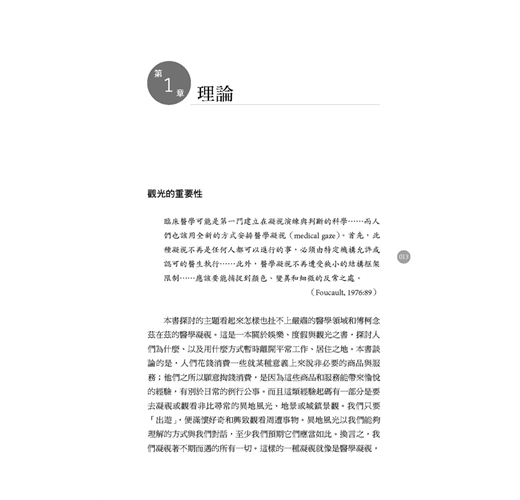本書探討的主題看起來怎樣也扯不上嚴肅的醫學領域和傅柯念茲在茲的醫學凝視。這是一本關於娛樂、度假與觀光之書,探討人們為什麼、以及用什麼方式暫時離開平常工作、居住之地。本書談論的是,人們花錢消費一些就某種意義上來說非必要的商品與服務;他們之所以願意掏錢消費,是因為這些商品和服務能帶來愉悅的經驗,有別於日常的例行公事。而且這類經驗起碼有一部分是要去凝視或觀看非比尋常的異地風光、地景或城鎮景觀。我們只要「出遊」,便滿懷好奇和興致觀看周遭事物。異地風光以我們能夠理解的方式與我們對話,至少我們預期它們應當如此。換言之,我們凝視著不期而遇的所有一切。這樣的一種凝視就像是醫學凝視,必須靠整個社會去安排和組織,使之系統化。當然,觀光凝視和醫療凝視完全是兩碼子事,因為觀光凝視不會只限由「某個機構支持和認可」的專業人士才能施行。不過就算要生產「非必要」的娛樂,也必須仰賴諸多專業人士幫忙建構和發展,好讓觀光客得以進行凝視的活動。