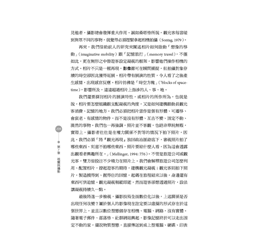 結合Goffman (1959)的劇場社會學 (dramaturgical sociology) 和Thrift (2008)的非再現性理論 (non-representational theory) 的「展演轉向」 (performance turn),本書倡議觀光凝視即是展演,並檢視展演背後的複雜社會關係和流動的權力結構。此一研究取向,同時也直接回應學界一直以來對「觀光凝視」論述中忽略視覺以外的感官和身體經驗的批判,也點出凝視理論涉及的多重感官都具有展演性,並透過「做」(doing)觀光攝影和物質文化 (如相機、遊覽車、汽車、紀念品等),說明凝視體現的「混合」展演和每一種觀看方式背後的技術與連結的物質性。