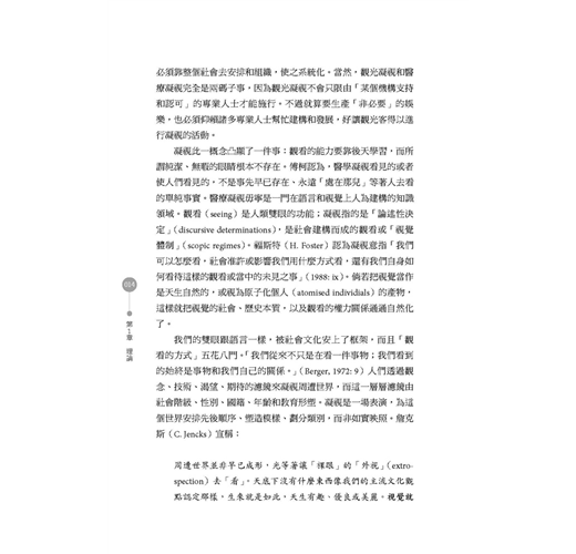 我們的雙眼跟語言一樣,被社會文化安上了框架,而且「觀看的方式」五花八門。「我們從來不只是在看一件事物;我們看到的始終是事物和我們自己的關係。」(Berger, 1972: 9)人們透過觀念、技術、渴望、期待的濾鏡來凝視周遭世界,而這一層層濾鏡由社會階級、性別、國籍、年齡和教育形塑。凝視是一場表演,為這個世界安排先後順序、塑造模樣、劃分類別,而非如實映照。詹克斯(C. Jencks)宣稱: