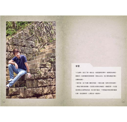 個性陽光、熱愛運動的傳一書中有收錄打高爾夫球英姿、墾丁玩水上活動、花蓮海邊寫真照,並特別重新造訪拍攝聽見幸福、遇見幸福300天、痞子英雄等主要場景照片。