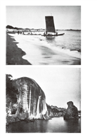 平埔番的房屋還算得上是乾淨、整潔、舒適,它們的樣式驚人的一致,在島上所有的定居點都一樣。整個住宅沿著一個方場的三面而建,後面的一部分供家庭成員居住,兩側則是畜禽的窩棚。在圖版三的圖片(圖8)裡展現了一座平埔番民居的後部和右側,左側與右側基本上一樣。房屋中間的空場分為兩部分,外面用來放置他們簡單的農具,晾曬農產品,旁邊有一個竹子搭建的簡陋的牛棚。裡面用泥土墊高,供家庭使用。這片堅硬平整的地面用來晾曬最有價值的農產品然後銷往市場。在這裡,村民們也有他們的村委會,也慶祝他們的節日,也在夜幕降臨後歡聚暢飲。一旦決定舉辦一場宴會,家中的長子要穿上一種類似於浴巾的東西,頭戴用蕨類植物的葉子編成的頭冠,挨家挨戶地去宣佈屆時他的雙親都將「在家」。到了預定的時間,賓客們成群結隊地趕來,年老和體弱的人圍坐在火堆旁大聲談笑,火光映照著他們古銅色的臉,給夜色裡的棕櫚樹戴上了金色的羽冠,在四周的竹籬上投下奇怪的影子。長輩們堆起蘆葦和木頭,年輕的男女踏著狂野的歌謠,在火光中跳舞到深夜。裡面升高的平台還能起到其他一些作用,其中最重要的就是在雨季保持房屋的乾爽。院子裡種著一些本地樹木,例如圖片右邊的番木瓜。這種植物產量豐富,容易生長,而且跟可可樹一樣在房前屋後比在精心照看的花園裡長得更好,更高產,枝葉也更繁茂。房子前面兩個小籃子裡那種低矮、葉片寬闊的植物是煙草,曬乾了可以供他們自己吸食之用。附加一句,他們用的煙袋也是取材於他們自己的竹子。這種煙草品質很好,但是他們經常在煙葉還是綠色的時候就拿來吸食了。另一種這個島上土生土長的植物,是一種藤蔓植物,當地人稱之為「愛玉」(Oigou)。它長有很多細小的種子,將這些種子浸泡在涼水裡,可以得到一種密實、美味、琥珀色的果凍。