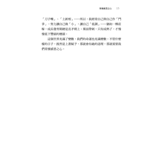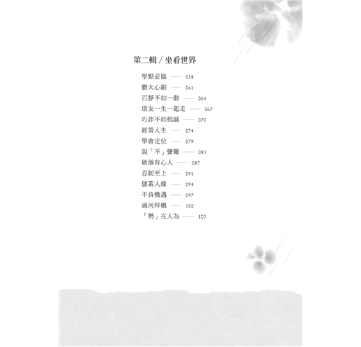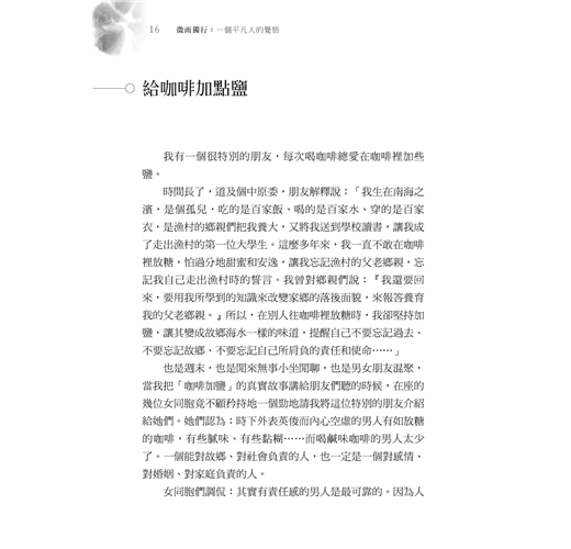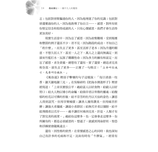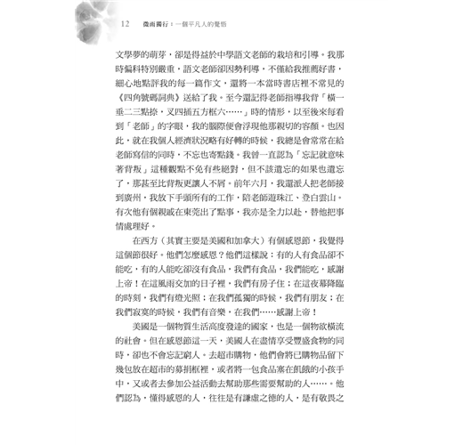 他後來經商,接觸人,接觸社會越發廣泛,大概也經歷過挫折,對人情冷暖、世事浮沉有了很多感受,但他那顆崇文之心、向善之心不變。他一邊觀察,一邊體驗,也一邊記錄,這本書裡的篇章,大概就是這種觀察和記錄的結果:真實、有感而發,包含著自己對人生的思索,也向讀者傳遞著他的善心和暖意。他是渴求著內心能寬闊,愛能感化堅硬的社會,每個人都能有尊嚴地立於世間。他把自己放在低處,卻一刻也沒有忘記嚮往、攀援在高處的事物。